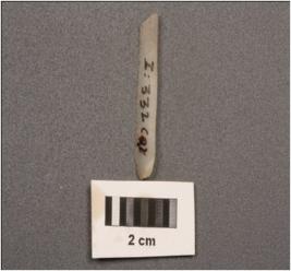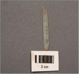| Description / विवरण | Parallel sided microlithic blade with prominent mid ridge on dorsal, use wear mark on left cutting edge of dorsal. Triangular in section and broken at distal end. |