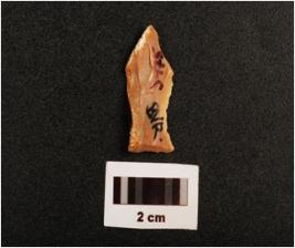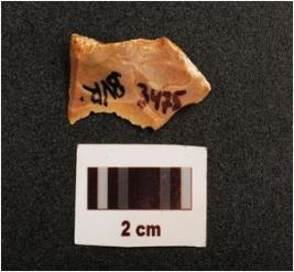 | Description / विवरण | A chert flake with flake scars on dorsal, bulb and ripple marks on ventral use wear marks on edge, |