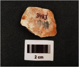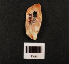| Description / विवरण | A chert end struck flake with flake scars on dorsal, striking platform, diffused bulb on ventral and use wear marks on edges, |