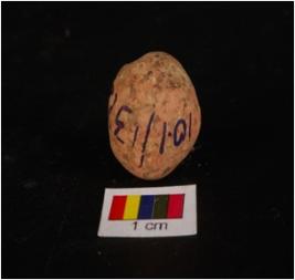 | Description / विवरण | Terracotta circualr in shaped sling ball, small in size and surface treated with wash in dull red colour. |