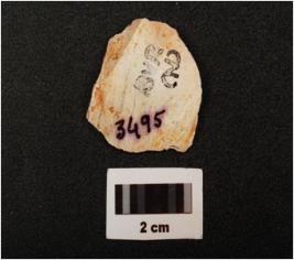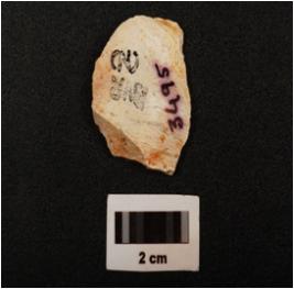 | Description / विवरण | A chert flake with smooth surface and flake scars on dorsal side, prepared platform, bulb on ventral side and use wear marks on edges, |