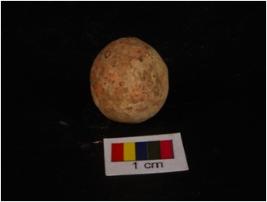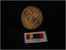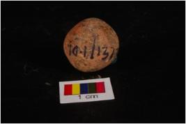 | Description / विवरण | Terracotta circular in shape sling ball, uneven shape and surface treated with wash in dull red colour. |