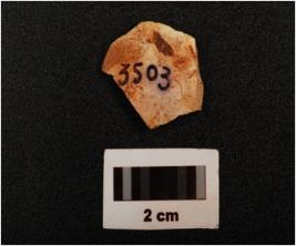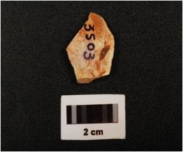| Description / विवरण | A chert flake with three blade scars on dorsal side, prepared platform, diffused bulb on ventral side, partly broken and use wear marks on one working edge, |