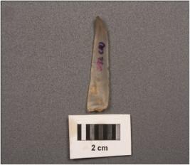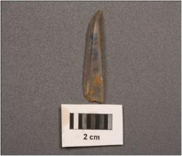 | Description / विवरण | Microlith point made on chalcedony with double ridge on dorsal. Tapering end and trapezoid in section. |