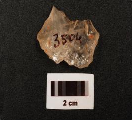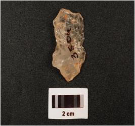 | Description / विवरण | A quartz blade with no improminent ridge on dorsal side, striking platform, diffused bulb on ventral side, broken along at distal end and use wear marks on cutting edges, |