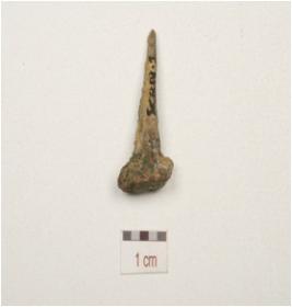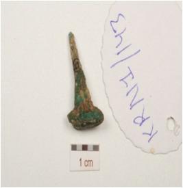 | Description / विवरण | A copper nail pointed end, corroded surface and circular head. |
