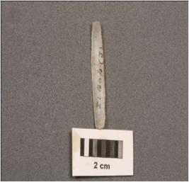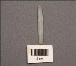 | Description / विवरण | Parallel sided chalcedony blade, two ridge on dorsal side, use wear on edge. |