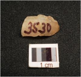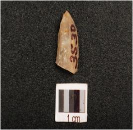 | Description / विवरण | Fragment of a blunted blade, flake scars on surface, cortex intact, use wear marks along the working edge, |