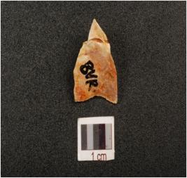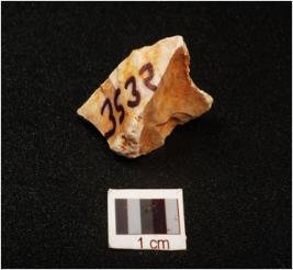 | Description / विवरण | Fragment of a flake made on chert , use wear marks on working edge, prominent bulb on ventral side, smooth surface, |