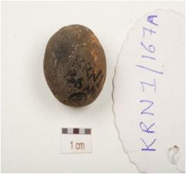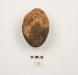 | Description / विवरण | A handmade terracotta sling ball, rough surface and chipped off surface. |