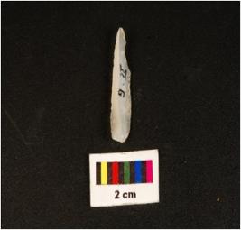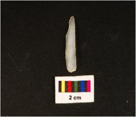 | Description / विवरण | Pen knife shaped chalcedony blade, mid-ridge on dorsal, flat ventral, use wear edges, proximal end. |