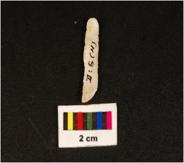 | Description / विवरण | Parallel sided microlithic blade with use wear marks on cutting edges and double ridge on dorsal. Diffused bulb on proximal end and trapezoid in section. Broken distal end. |