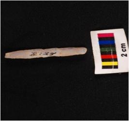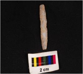 | Description / विवरण | Parallel sided microlithic blade with two ridges on dorsal side. Diffused bulb on ventral side, trapezoidal in section and use wear marks along the edges. |