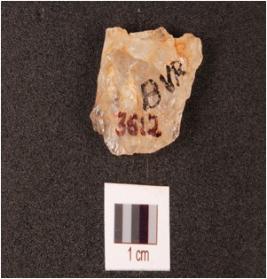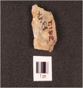 | Description / विवरण | A quartz flake with smooth and irregular surface, slightly pointed towards one end. |