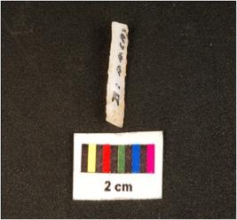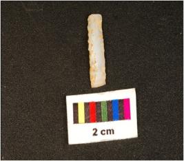 | Description / विवरण | Parallel sided chalcedony blade, mid- ridge on dorsal, flat ventral, irregular edges, proximal ends. |