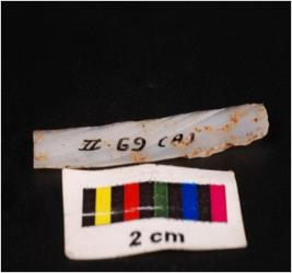 | Description / विवरण | Parallel sided chert blade with mid ridge on dorsal ventral is smooth with prominent bulb and use wear marks on edge. |