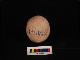 | Description / विवरण | Terracotta sling ball, round in shape, smooth surface and surface treated with a wash in red colour. |