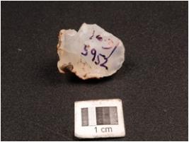 | Description / विवरण | Core, made on chalcedony three flake scars on surface, use wear marks on cutting edge and cortex on surface, diffused bulb on ventral and triangular in section. |