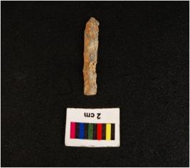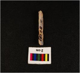 | Description / विवरण | Parallel sided microlith blade with use wear marks on cutting edges and prominent mid ridge on dorsal side, rough surface, bulb on ventral side, triangular section. |