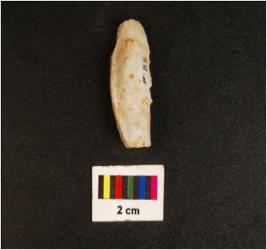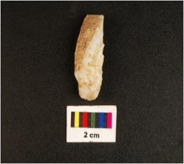 | Description / विवरण | A core turned to a scraper with three blade scars, heat treated working edge of the scraper retouched. |
