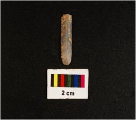 | Description / विवरण | Parallel sided microlithic blade with mid ridge on dorsal. Diffused bulb on proximal end and triangular in section. Use wear marks on cutting edges and broken at distal end. |