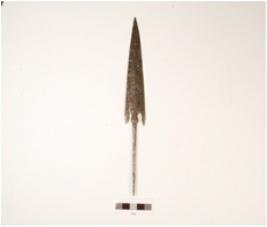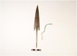 | Description / विवरण | An iron arrow head with tang, pointed top, thin round tang with pointed end, flat head with proper edges and polished. |