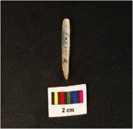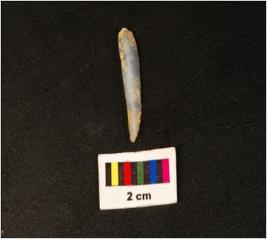 | Description / विवरण | A microlithic point with a mid ridge on dorsal side, prepared plat form, diffused bulb on ventral side, usewear marks on cutting edge, triangular in section and pointed at distal end. |