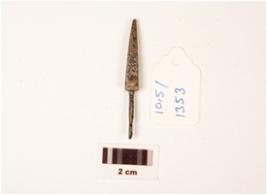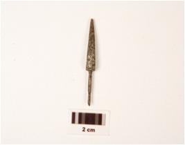| Description / विवरण | Fragment of an iron arrow head with tang, pointed top thin round tang with pointed end, rough surface, proper edges and polished. |