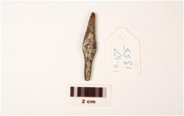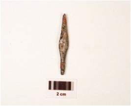 | Description / विवरण | A fragment of an iron arrow head with tang, diamond shaped surface with pointed top and round end, proper edges, rough surface and polished. |