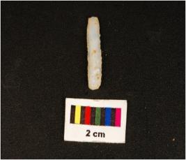 | Description / विवरण | Parallel sided chalcedony blade, mid- ridge on dorsal, flat ventral, use wear edges, proximal ends. |