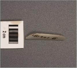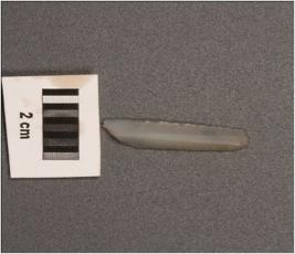 | Description / विवरण | Chalcedony parallel sided blade with a ridge on dorsal, and use-wear marks along the cutting edges and broken along proximal end. |