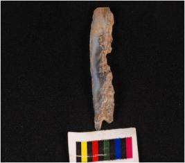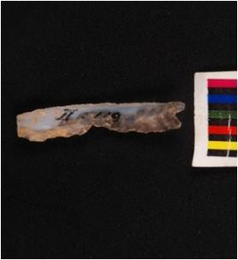 | Description / विवरण | Blade with two ridges on dorsal side. Trepczoidal in section, diffused bulb on ventral side and use wear marks on left cutting edge. Diffect in raw material. |