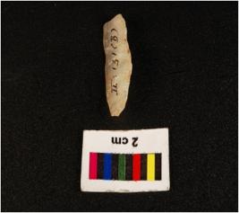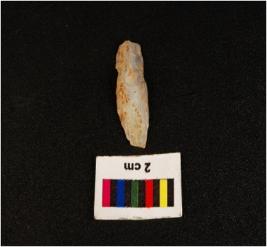 | Description / विवरण | Parallel sided microlith blade with use wear marks on cutting edges and prominent ridge on dorsal, diffused bulb on ventral side, uneven surface and triangular section. |