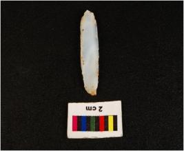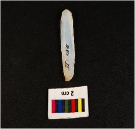 | Description / विवरण | Parallel sided microlith blade with use wear marks on cutting edges and it has two ridge on dorsal side trapezoid section. |