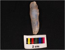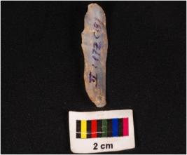 | Description / विवरण | Parallel sided microlithic blade with two ridges on dorsal side. Trapezoidal in section. Use wear marks on edges and bulb on ventral side. |