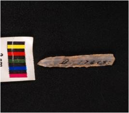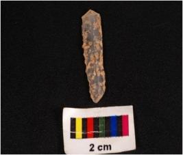 | Description / विवरण | Parallel sided microlithic blade with a mid ridge on dorsal side, triangular in section and use-wear marks along cutting edges. |