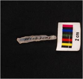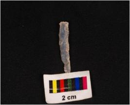 | Description / विवरण | Parallel sided microlithic blade with a prominent ridge on dorsal side, diffused bulb on ventral side and use wear marks along cutting edges. |