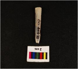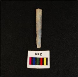 | Description / विवरण | Parallel sided microlith blade with two ridges on dorsal side, prominent bulb on proximal end, it has trapezoid section. |