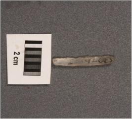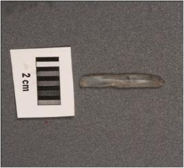 | Description / विवरण | Chalcedony parallel sided blade with a single ridge on dorsal, triangular section and regularly retouched edges. |