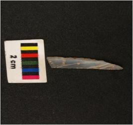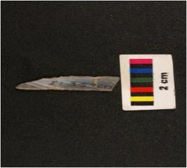 | Description / विवरण | A small pen knife blade made on chalcedony, mid ridge on dorsal side and diffuse bulb on ventral side along with proximal and distal end is sharp and use wear marks on edge. |