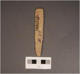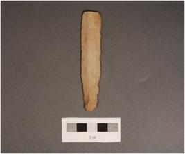 | Description / विवरण | A blade made on chert with mid ridge on dorsal side, use wear marks along the cutting edges, diffused bulb on ventral side and triangular section. |