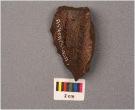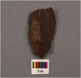 | Description / विवरण | A side scraper on end struck flake, use wear marks on cutting edges, triangular in section and cortex on dorsal side. |