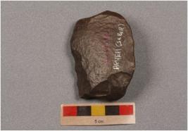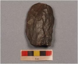 | Description / विवरण | End scraper on end struck flake, prepared platform, bulb on proximal end, use-wear mark on ventral triangular section and flake scars on dorsal. |