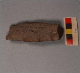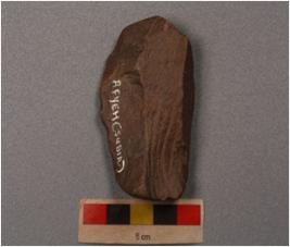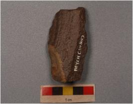 | Description / विवरण | Side scraper on end struck flake, prepared platform. Flake scars on dorsal side, triangular in section and cortex on rught dorsal. |