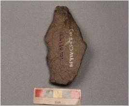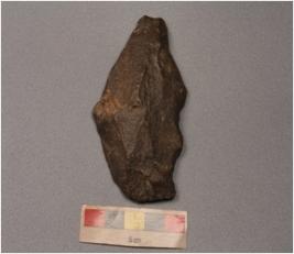 | Description / विवरण | A side scraper, Flake scars on dorsal side and irregular retouches on right dorsal side. |