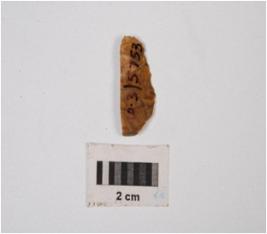 | Description / विवरण | A flake made on chert, flake scars on surface, use wear marks on cutting edge. |