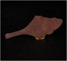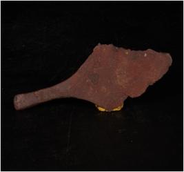 | Description / विवरण | A piece of copper spear head, surface is pointed and sharp, edges are broken, handle is long, surface corroded. |