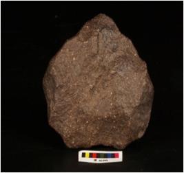 | Description / विवरण | A side scraper made on side struck flake, flake scars on dorsal side, fine retouches along working edges and prominent bulb on ventral side. |