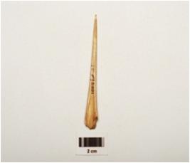 | Description / विवरण | A bone point with sharp working pointed one end another damaged and a natural groove on the surface and polished surface. |