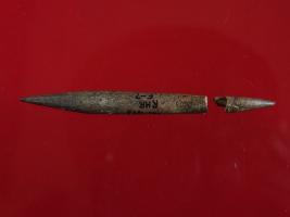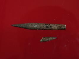 | Description / विवरण | Trench E-7, Depth 55 cm, Pit 3 sealed by layer 1 It is a stylus, broken into two pieces made of bone. There is a sharp point on the both ends. Surface is smooth and brownish appearance. |